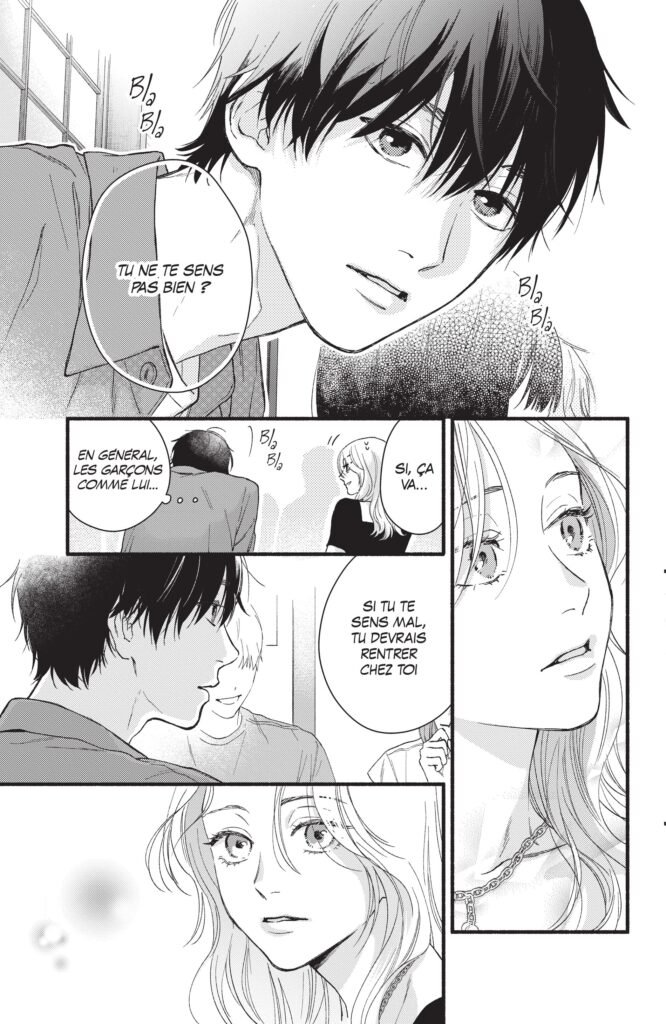Puis de l’autre, nous avons Kôsei, un jeune homme qui ne prend aucunement les histoires d’amour au sérieux, préférant s’amuser. Pour le personnage de Kôsei, on a l’impression qu’il n’est pas entièrement en phase entre ce qu’il veut et ce qu’il fait.