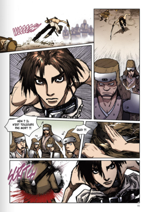 D’une part, les teintes marrons mêlées aux hachures représentent bien l’univers dur et historique. Les scènes de combats sont très dynamiques avec beaucoup d’effets de mouvement. Enfin, les designs des personnages ont beaucoup de style.