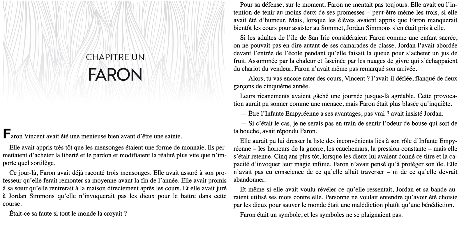 Toute puissante, la jeune femme pensait n’avoir plus aucune guerre à mener. Jusqu’à ce qu’elle découvre, lors d’un sommet international pour la paix, que sa sœur aînée, Elara, noue un lien sans précédent avec un dragon ennemi. Les dieux se montrent formels : pour briser ce lien, Faron devra tuer Elara…Hachette
