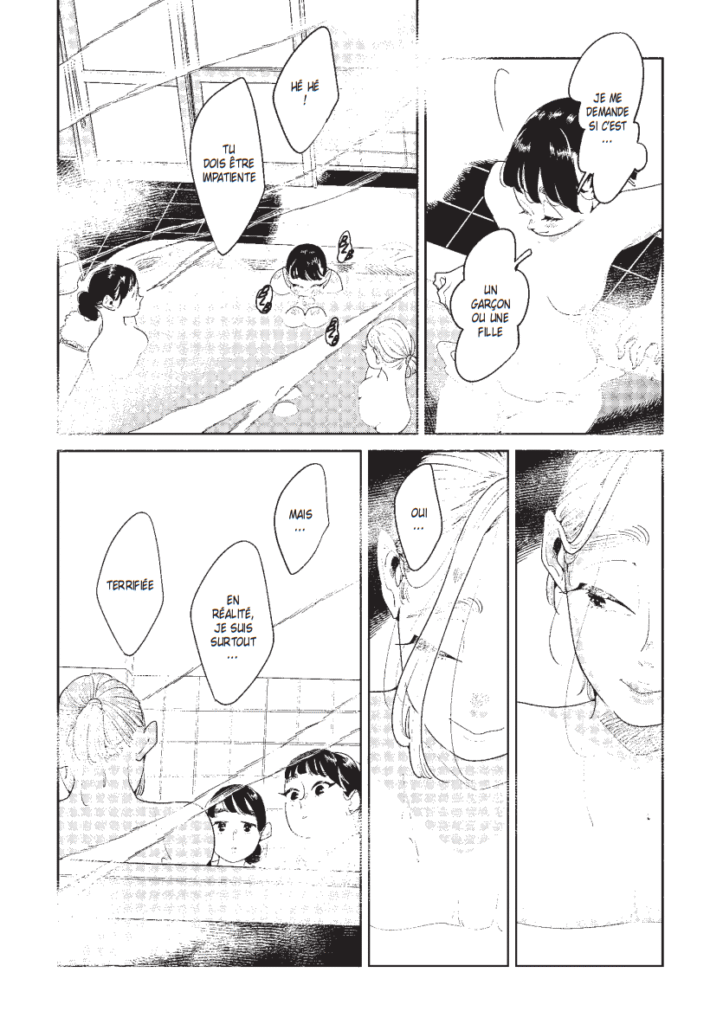 De plus, la nudité et le rapport au corps sont très intéressants dans cette œuvre. Que ce soient les changements physiques de Midori par rapport à sa grossesse, ou des scènes de bain entre amies, les corps nus sont dépeints avec une subtilité et un réalisme que je trouve touchants. Ils ne sont pas sexualisés, tout en étant beaux, et cette attention avec laquelle l’autrice les a représentés est magnifique tout en étant utile.