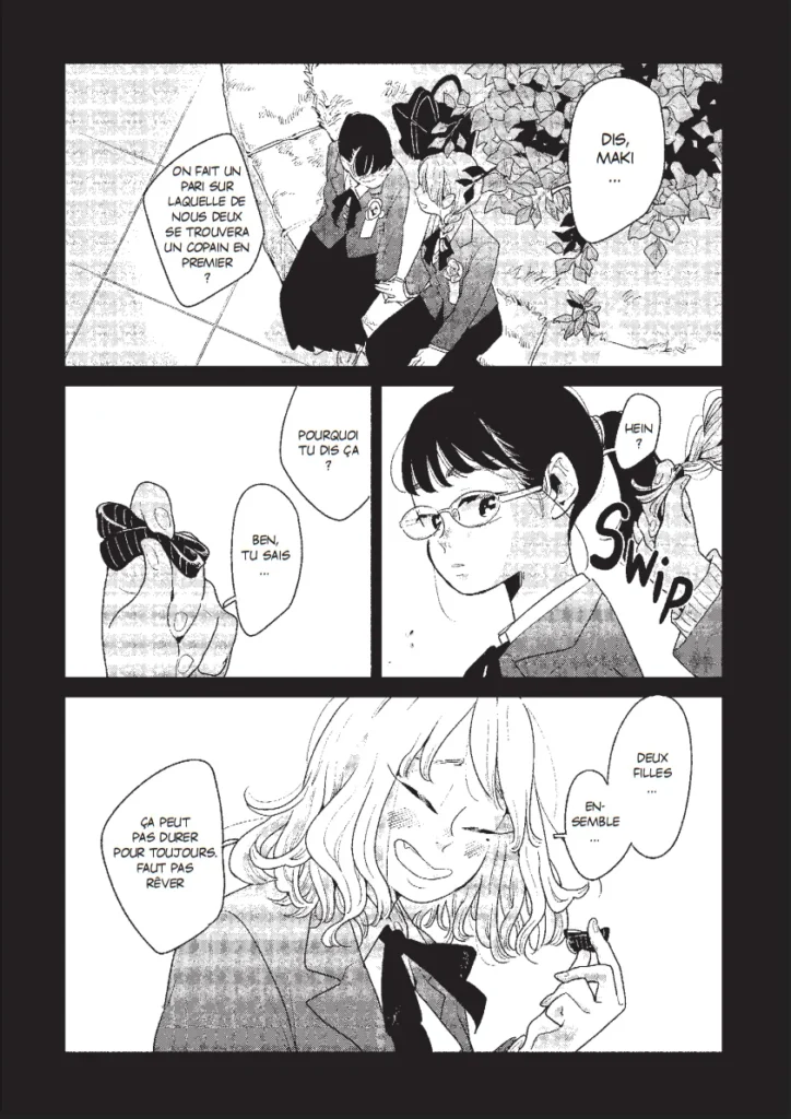 Et c’est là tout le propos de l’œuvre de Battan. Dès les premières pages, Midori qualifie la relation qu’elle avait jusqu’alors avec Maki d’enfantine. Maintenant qu’elles ont fini le lycée, elles se doivent de rentrer dans le moule de la société patriarcale. À savoir se marier et avoir des enfants. La pression familiale accentue tout ceci.