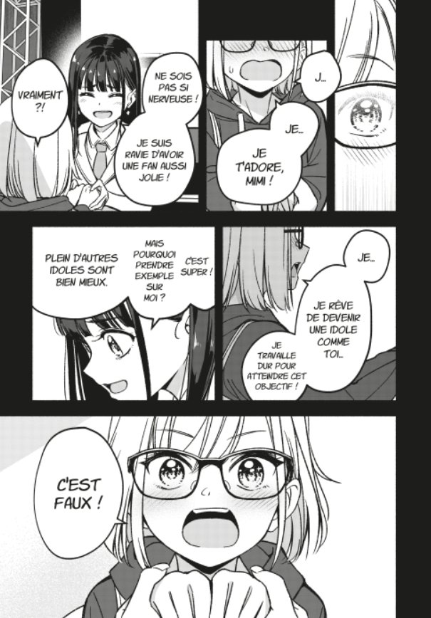 Elles partagent la même motivation et la même détermination. Et il en faut, particulièrement dans le milieu des idoles japonaises, un monde impitoyable. Mais il n’y a pas seulement elles, pour l’instant rien que dans ce tome, il y a aussi Koyuki Hiiragi. À voir comment elle évoluera dans les prochains tomes.