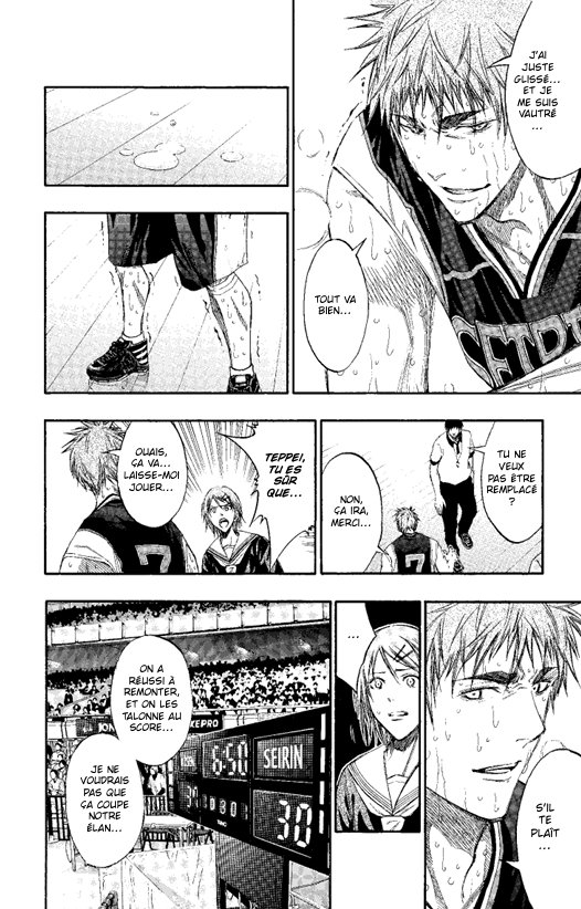 Par conséquent, nous voyons l’équipe de Seirin, en pleine difficulté, menée de plusieurs points par Yôsen. Entre la fatigue de Kiyoshi, les techniques de Kagami qui ne passent pas auprès de Murasakibara ainsi que son entêtement, parviendront-ils à se dépasser et gagner le match tout en accédant au prochain tour ?