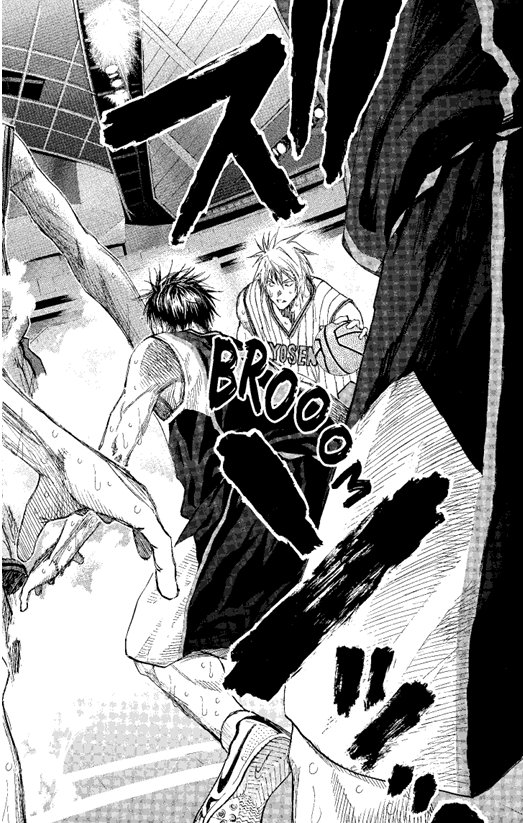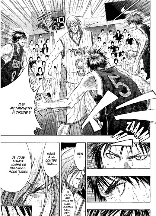 Kagami explose de combativité face à son ancien camarade. Le Bouclier de Zeus, la défense de Yôsen, désormais transpercée, Seirin commence à réduire l’écart des points. Malgré l’état de fatigue avancée de leur nouveau meneur, Kiyoshi, les joueurs font une belle démonstration de leur esprit d’équipe à leur adversaire du jour. Malheureusement pour eux, leur fougue réveillera la fureur d’un démoniaque géant en la personne de Murasakibara…