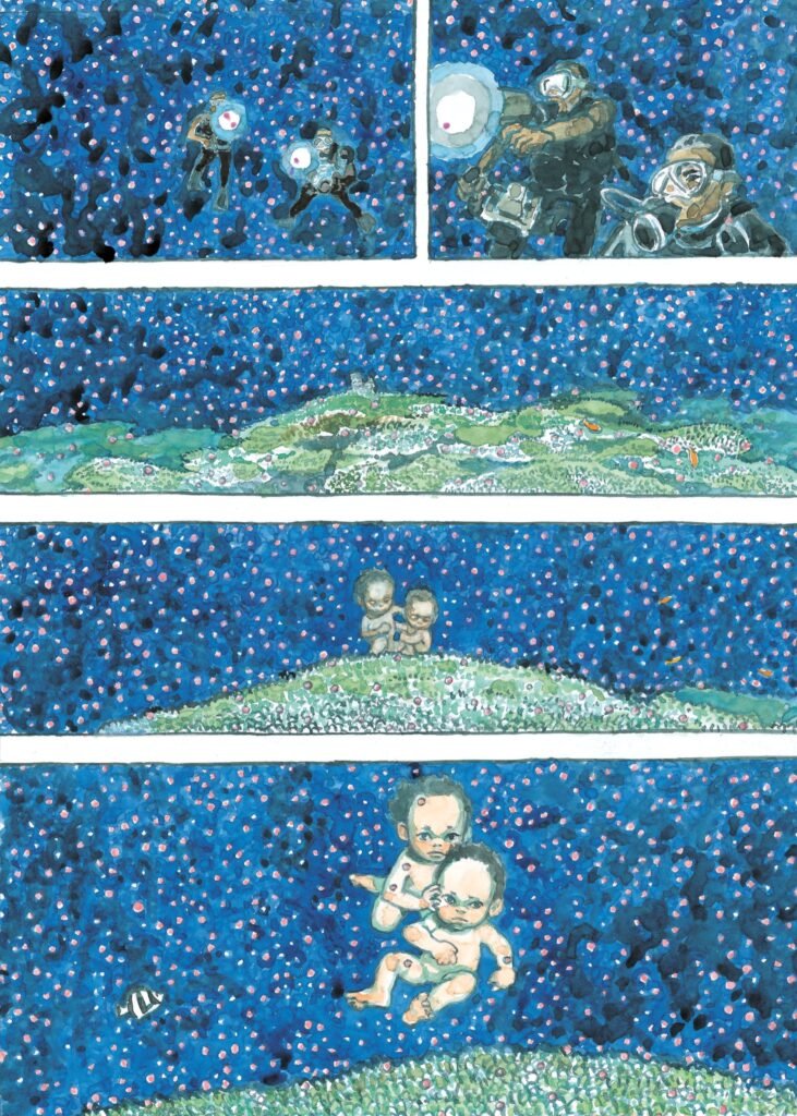 Avant d’entrer dans le récit, l’auteur propose une ouverture un peu spéciale. Les premières pages, en couleur, permettent d’introduire l’histoire avec une scène fantastique : deux plongeurs venus observer « la ponte du corail », un moment apparemment magique ; et au milieu de ce moment spectaculaire, deux bébés qui nagent dans l’océan, tels deux poissons dans l’eau.