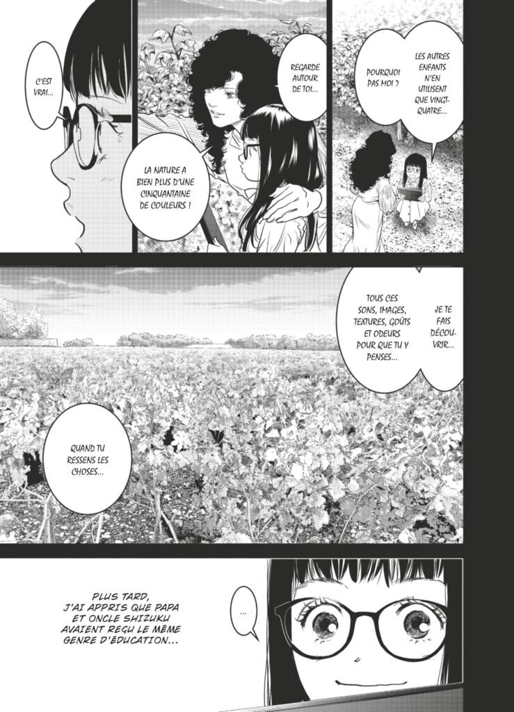 En plus de nous faire parcourir son monde à travers ses esquisses, les dessins sont également très attrayants. Ainsi, les artistes ont incroyablement réalisé les paysages et les monuments. Quand Seiya nous décrit ce qu’elle aperçoit en fermant les yeux, on peut, grâce à ses descriptions, imaginer explorer les palettes de couleurs, même si les illustrations sont en noir et blanc. Cela m’a concrètement donné envie de lire le manga original, surtout s’il est aussi génial que celui-ci.