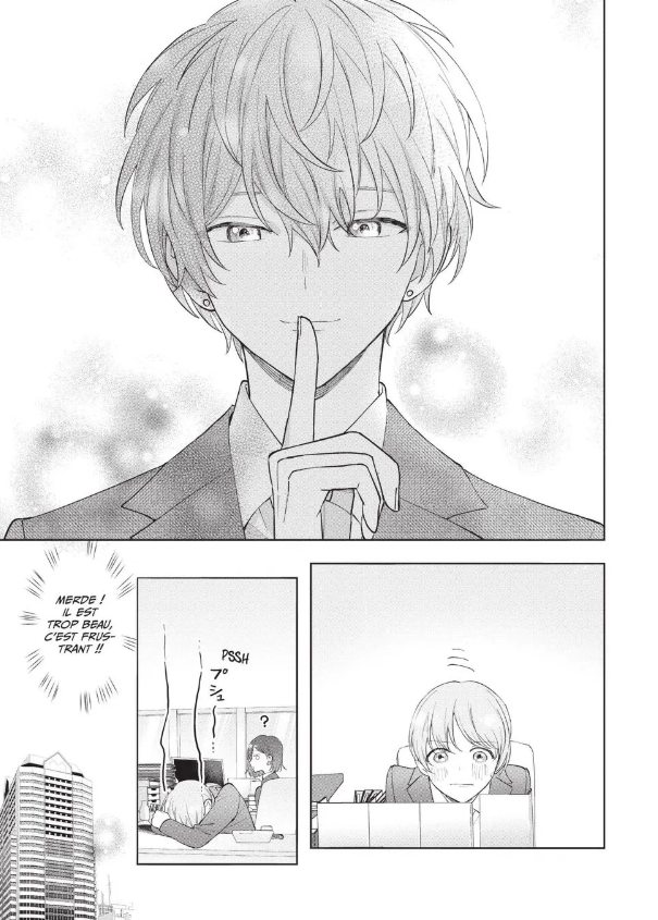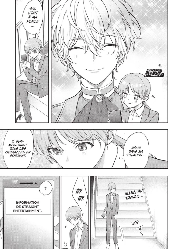 De plus, on remarque bien que Riku a encore du mal après un mois à oublier son ancienne vie. Il a toujours certaines mimiques ou agit encore parfois comme un idol, même dans l’entreprise. C’est totalement plausible car les idols apprennent souvent à se comporter d’une certaine façon avec les fans. Certaines habitudes restent encore ancrées.