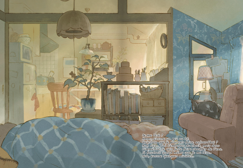 Le choix des lumières (un plafonnier, des LED en guirlande ou une lampe de chevet), des plantes (une Monstera, des tulipes dans un vase élégant ou quelques petites fleurs semblant avoir été cueillies en chemin) et de tant d’autres éléments immerge d’autant plus les lectrices et lecteurs.