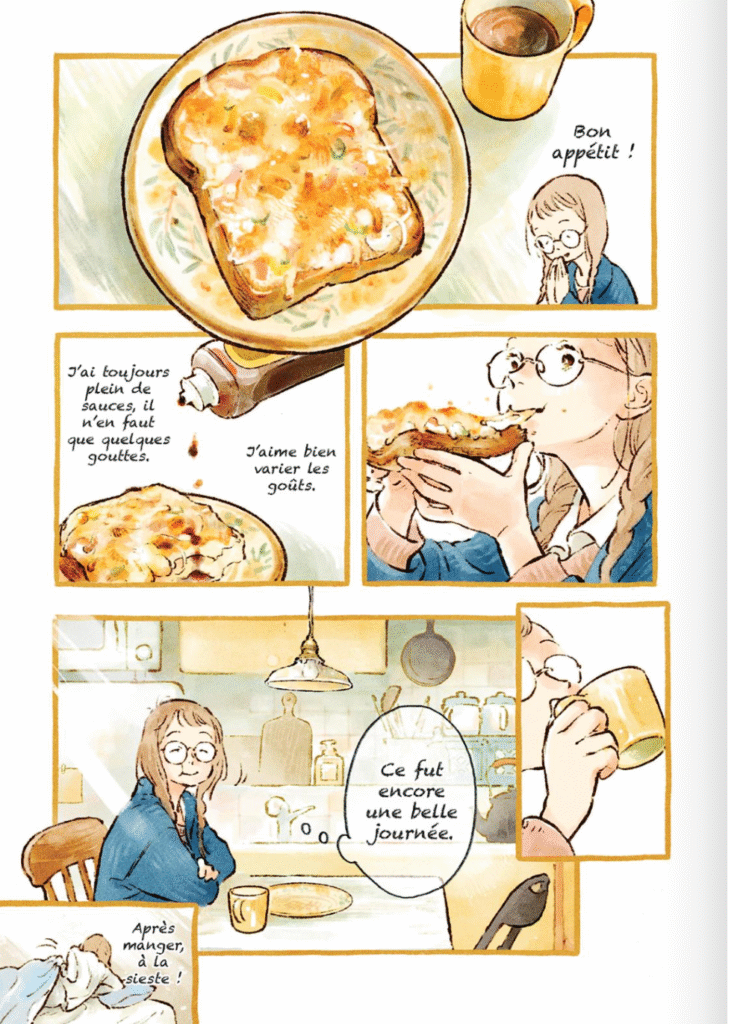 J’ai trouvé cela original et génial. En plus de nous donner plus d’informations sur les goûts des résidentes, on peut aussi s’amuser à reproduire les plats, sucrés comme salés, qu’on les voit déguster et parfois aussi préparer. Pour cela aussi, Chiaki Ida excelle, avec des dessins qui donnent envie de se procurer ce que l’on voit au plus vite.