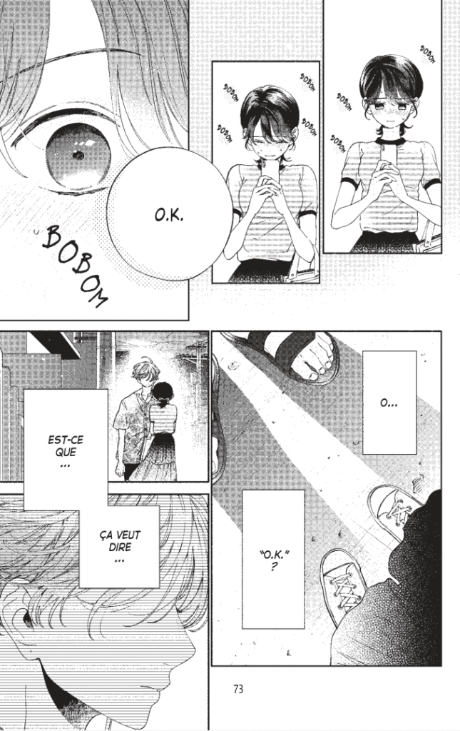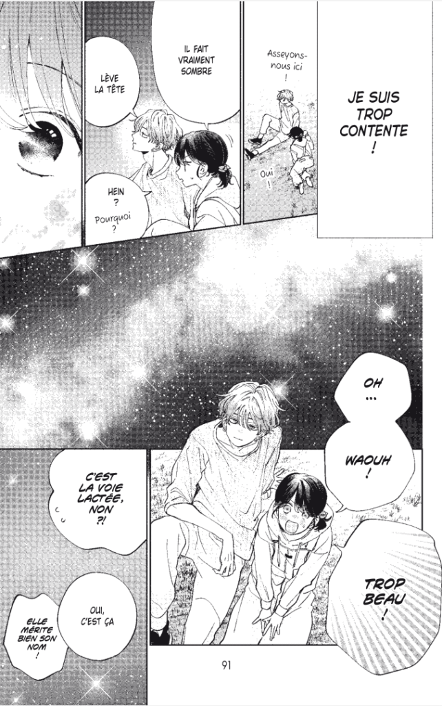 Le récit s’accélère ensuite avec un incontournable : le voyage scolaire, organisé sous la forme d’un camp d’été en pleine montagne. Loin du lycée, nos deux protagonistes se retrouvent confrontés à une intimité particulièrement troublante. La préparation du repas ou l’observation des étoiles deviennent des prétextes pour faire monter la tension amoureuse. C’est également durant ce séjour qu’un incident assez banal change la donne pour le reste du groupe d’élèves. En rattrapant Sana lors d’une chute, Doigaki, un garçon jusqu’ici très discret, dévoile accidentellement un visage d’une beauté exceptionnelle. L’introduction de ce nouvel élève apporte une dose de rivalité bienvenue et redynamise le scénario.