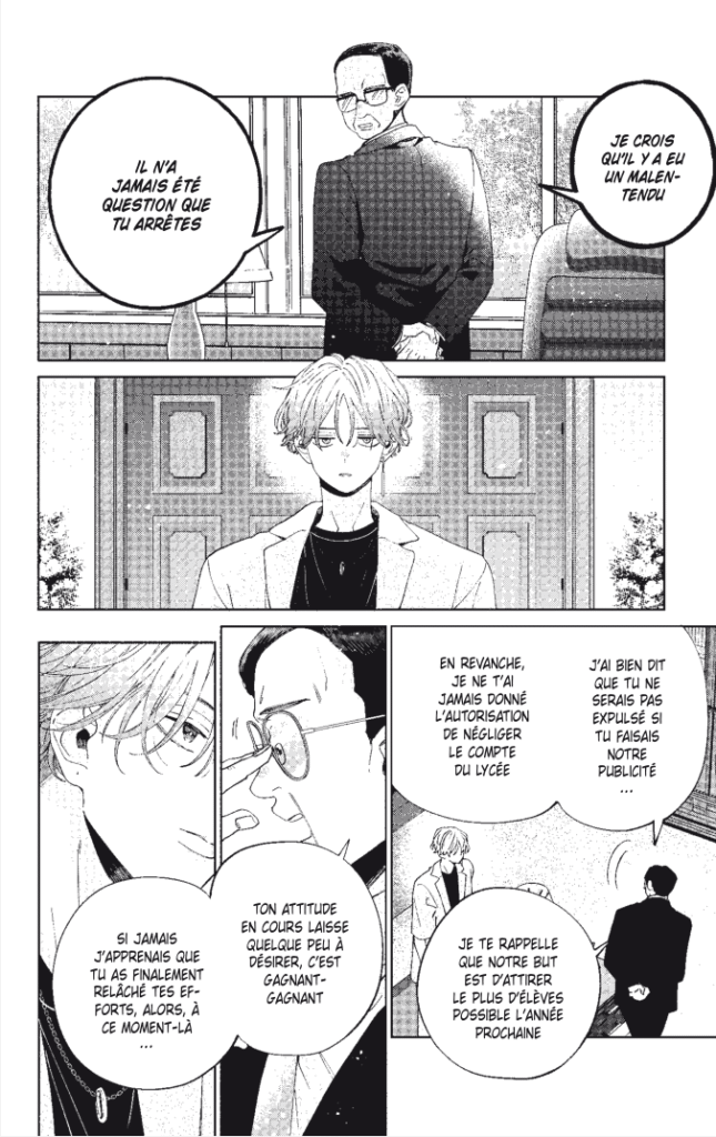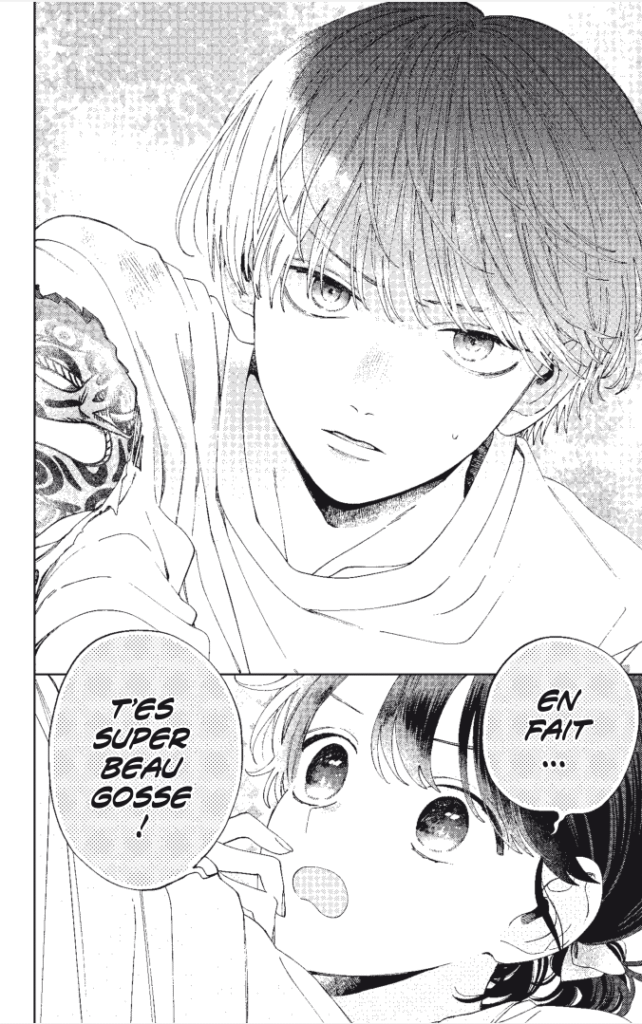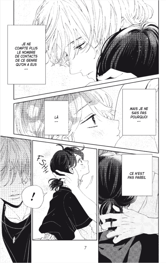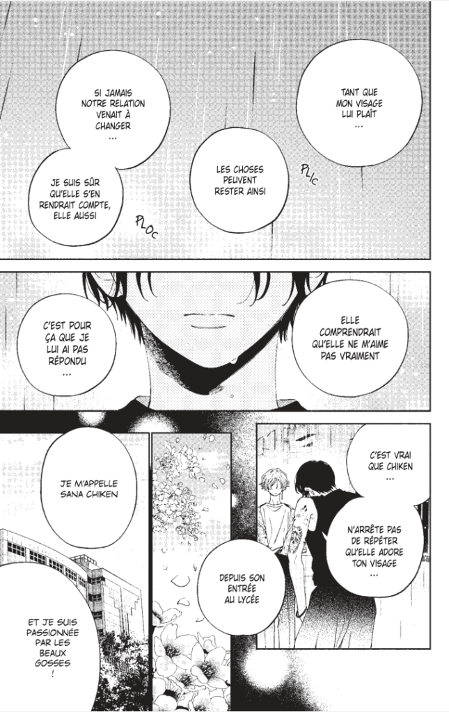 L’autrice va plus loin : elle nous montre les failles d’un garçon qui manque très cruellement de confiance en lui. Kanato souffre d’un complexe d’infériorité, intimement persuadé que seule son apparence extérieure suscite l’intérêt des autres. Il craint que Sana finisse fatalement par découvrir sa vraie personnalité, qu’il juge beaucoup trop banale et ennuyeuse.