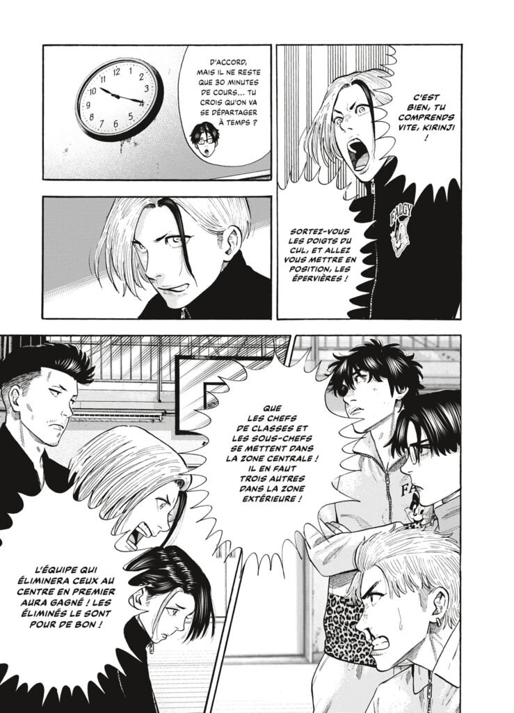 Alors que dans le volume précédent, l’auteur mettait surtout en avant le pierre-feuille-ciseaux, il propose cette fois un duel sur fond de balle au prisonnier. Un affrontement à la fois sportif, intellectuel et technique, encore plus à la façon Yakuza. J’ai trouvé que le combat entre les deux classes était passionnant à lire. Que ce soit les Épervières ou les Cerisiers, tous ont démontré leur potentiel. J’aurais voulu voir Shô un peu plus et qu’il exploite davantage ses capacités. Car je sens que ce garçon en a énormément.