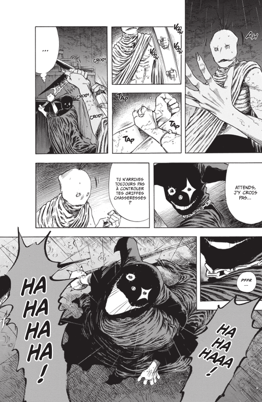 Transformé à son tour en créature de la nuit, Osamu se réveille dans le manoir, un sac sur la tête, et son bras métamorphosé en une immense faux d’os. Ce qu’il a vécu n’était pas un cauchemar : il est devenu un monstre. Pris de panique et désespéré face à cette nouvelle existence, il songe au suicide, incapable d’envisager l’avenir.