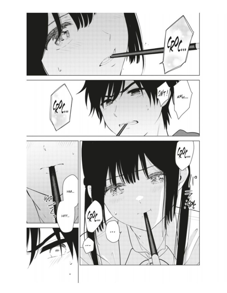 Dès les premières pages du tome 3, la tension est à son comble ! Nous retrouvons Miku en pleine tourmente, avec des pensées perturbées, représentées par des bulles explosives exprimant son excitation.