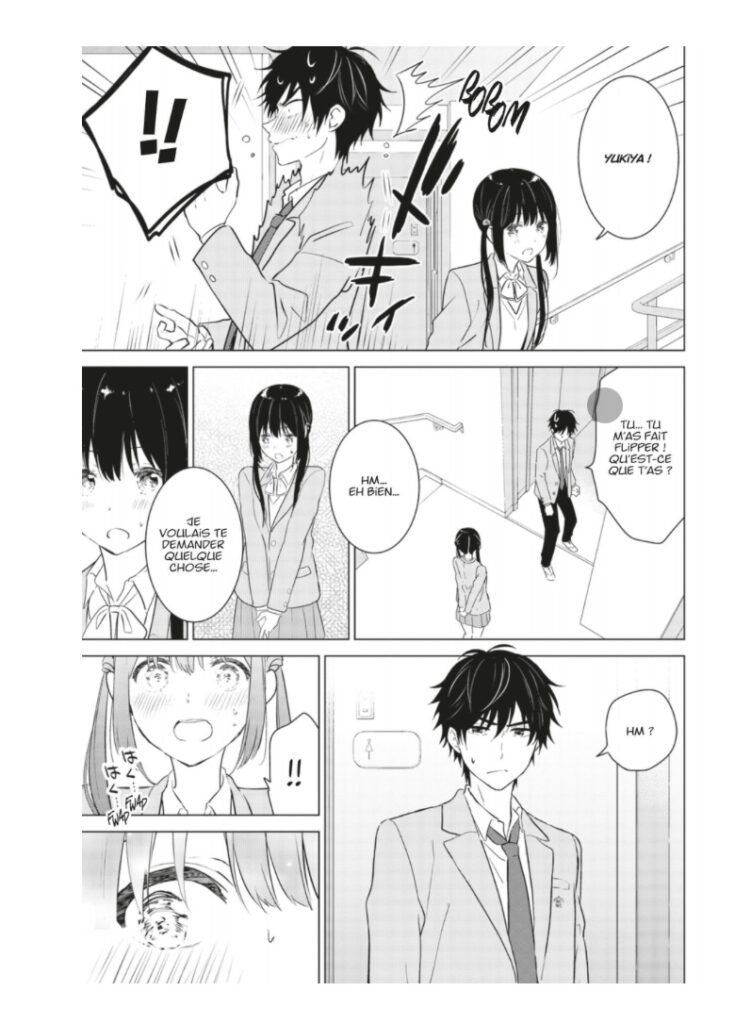 Puis, c’est au tour de Miku de faire un pas vers lui ! Elle propose à son tour une idée de date. Un autre classique bien connu dans le monde du shojo : « on rentre ensemble après les cours ? ». Sûr de ne pas échouer à ce test si évident, Yukiya relève le défi.
