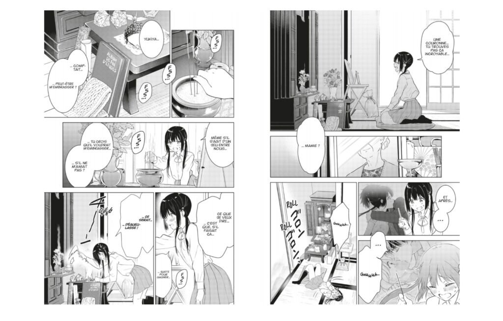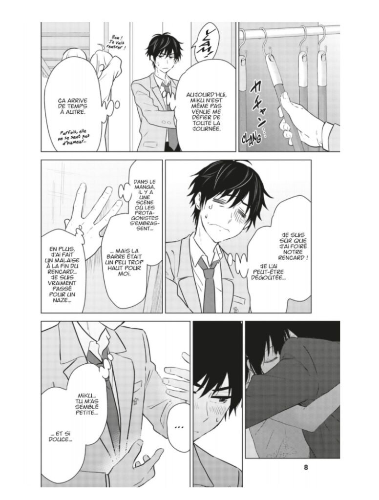 On peut voir qu’ils prennent leur jeu très au sérieux et s’inspirent encore une fois des scènes clichées des shojos pour gagner. Dans ce tome, on monte d’un cran, on passe des mots aux actions (d’où l’importance du consentement). Dans les limites du raisonnable, chacun tente un rapprochement.